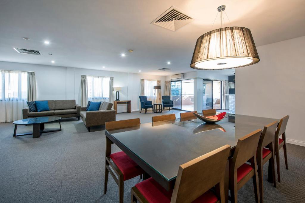 Choose from spacious hotel rooms or fully self-contained 1, 2, and 3-bedroom apartments—ideal for families, longer stays, or those looking for the comforts of home, like a fully equipped kitchen. Guests can also unwind with a swim in the heated rooftop indoor pool or get in a workout at the onsite gym. Located in the heart of East Perth, you'll be just a short walk or free bus ride from shops, parks, cafes, and essential services. At Mantra on Hay, you’ll find a calm, welcoming space in the city—perfect for rest, recovery, or a productive trip.